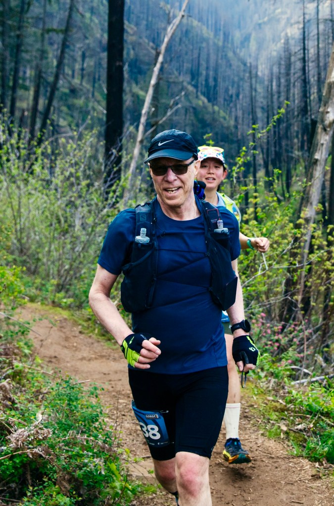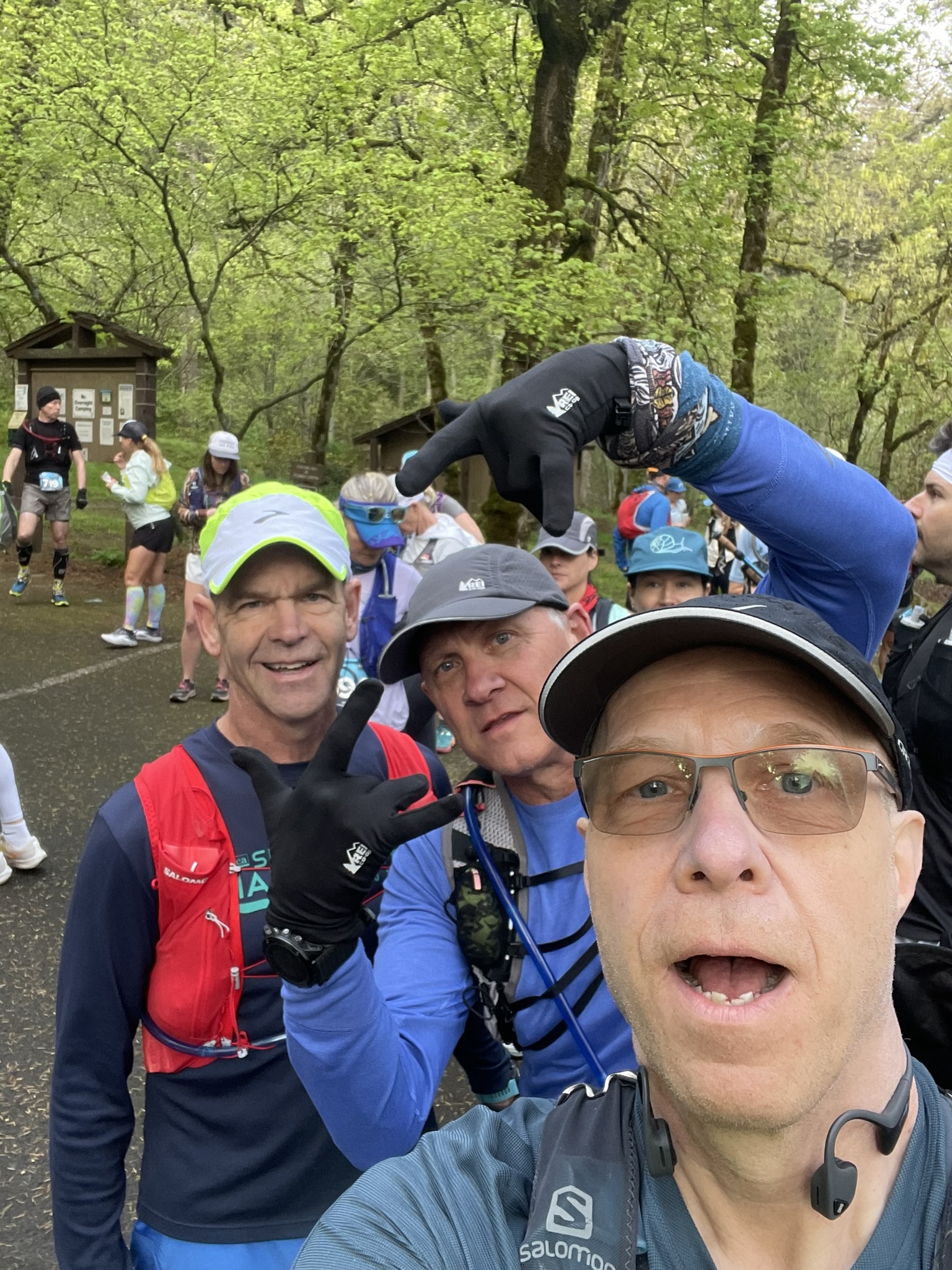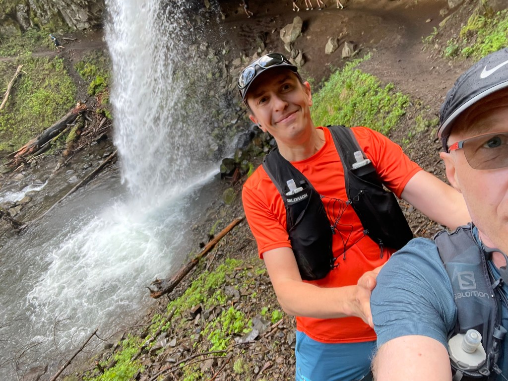 At around mile 26 I started to feel light headed and sat down on a log, lowering my head. Was the race unravelling now? I started to doubt my ability to finish. This nice runner who I had seen many times, Geoff, caught up and asked me if I was okay. I shared that I was a bit dizzy. He offered me a GU electrolytes tablet to mix with water, which I took and either the few minutes resting or his encouragement or the electrolytes or some combo revived me. We started walking and then after a few minutes, I said to him “Can we start running again”. He says “Oh, I was walking for your benefit”. So we started running and I ran/walked with Geoff and another guy Matt into the aid station, Cascade Locks (second time) at mile 28/29.