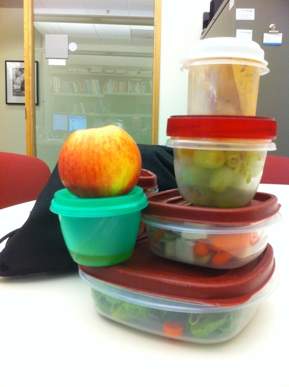 My tower of containers for Monday includes a green salad with veggies and 1.7 ounces of left over baked salmon (yes, I weighed it); 1 tablespoon balsamic & olive oil salad dressing; some cherry tomatoes for the salad (separated because I don’t like to refrigerate tomatoes); jicama, celery, and carrots; 2 tablespoons of hummus; half-cup of grapes; and a small Fuji apple.