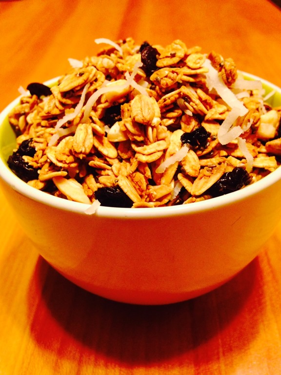 Paul and I like to eat granola but frankly most of the granola out there that you can buy is full of fat and sugar, and over-processed. Making your own granola, however, is quite easy. My granola recipe is influenced by Kathleen Daeleman’s crunchy granola recipe from her book Cooking Thin with Chef Kathleen, but I’ve made it even healthier by reducing the sugar and adding chia, flax, and cocoa nibs. It’s of course a completely plant-based (vegan) recipe.