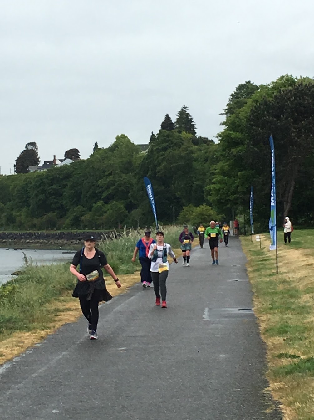 The course was about 80% asphalt and about 20% concrete, but with my foot bothering me, I took every chance to run on the grass or dirt to the right of the path. This seemed to help a bit. I wore a Nathan hydration vest, which obviated the need to stop at aid stations but I did make one quick stop to pee sometime after the half way point.