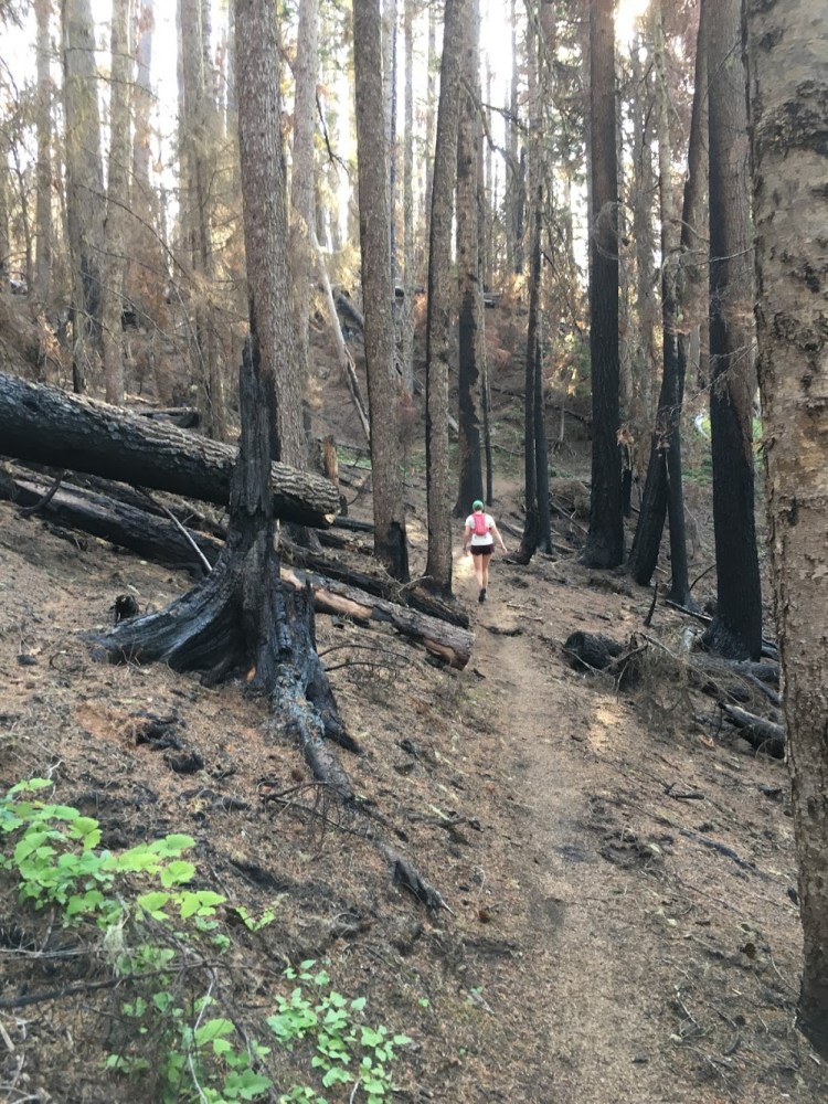 The forest service had only opened up this the portion of the trail a few weeks prior to the race. Now I knew why. The landscape was heavily blackened by last year’s fires. The trail was very dark in places, with lots of soot mixed in with the dirt.  This made the footing a little tricky in places, even a little dangerous in places along some steep fall offs.