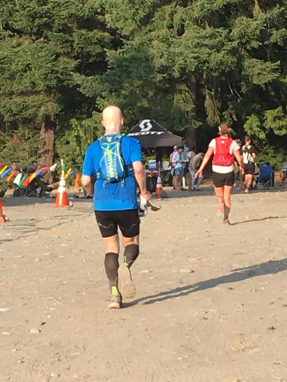 Another volunteer made his way over (I wish I remembered their names) and asked me how he could help me. What a wonderful thing that these volunteers were so helpful when I was at my lowest. Just as if they were a sales rep at Nordstroms and I was one of their top customers with a fist full of credit cards ready to purchase thousands of dollars of clothes. But there was really nothing in it to motivate this awesome crew of volunteers other than the good feeling in their hearts, knowing they helped another runner achieve their goal. (I hope to pay that back a little volunteering again at Cascade Crest 100 in a couple of weeks.) Speaking of Nordstroms, I mentioned that I wanted to change my shoes, and suddenly the shoe salesman in my volunteer came to life. I muttered something about being able to do it myself, but before I knew it my Topo Terradventures  had been untied and removed, and my Salomon Sense Rides were securely on my feet. Talk about service! I next mentioned that I wanted to put my poles in my bag since I had little use for them on the remaining 13 miles. I collapsed them and he carefully placed them into my drop bag with my dusty pair of Topos.
